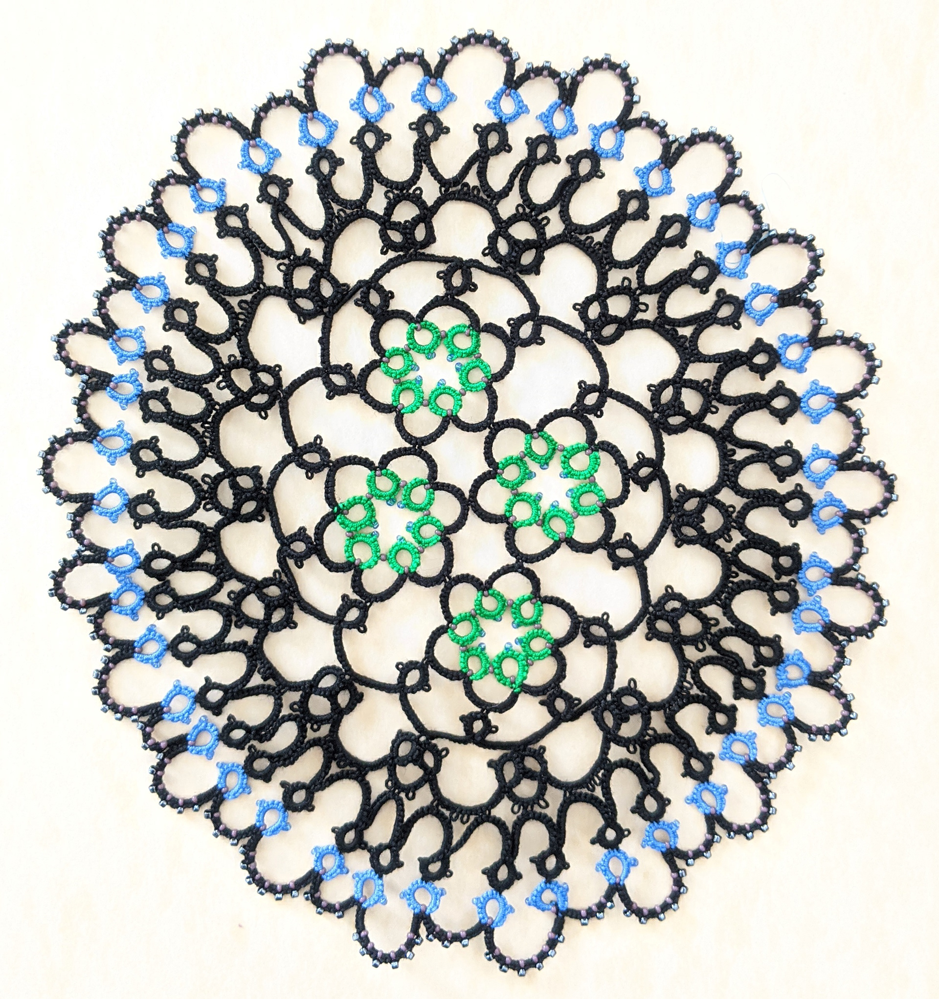 The four movements are represented by the 4 motifs in the center worked in green thread with beads. This journey in thread started with a vintage pattern published as part of “Three Delectable Tatted Doilies” from a J & P Coats Book.